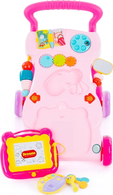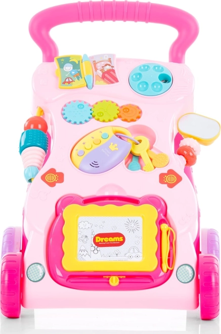 Inclusief tekentablet met pen, spiegeltje, kleurrijke tandwielen, knopjes en sleutels met een “slimme” afstandsbediening. Afneembaar speelgoed kan ook los gebruikt worden, wat het speelplezier verlengt en creativiteit stimuleert. De loopwagen speelt lichten, melodieën en geluiden af en prikkelt zo gehoor, zicht en concentratie. Verpakt in een geschenkdoos – een geweldig cadeau-idee.