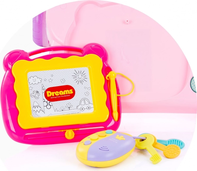 Tekentablet met pen, tandwielen, knopjes, spiegeltje en sleutels met afstandsbediening stimuleren de fijne motoriek, het zicht en het gehoor.