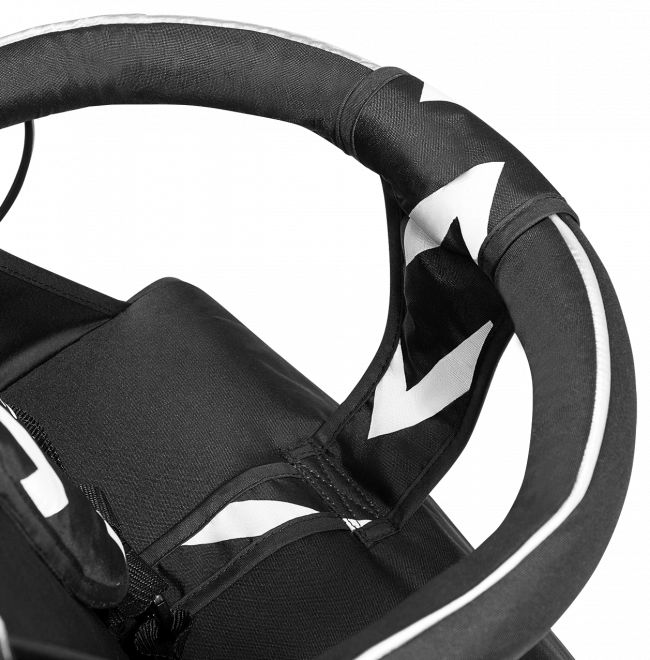 5-punts gordel met zachte pads, voorbeugel en voetrem voor veilig stoppen. Zwenkende EVA-wielen met vergrendeling en voorvering voor een soepele rit.