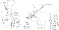 De praktische uitrusting omvat een verstelbare duwbeugel, een afneembare veiligheidsbeugel van eco-leer, een ruime boodschappenmand met een draagvermogen van 9 kg en een vak in de kap. De veiligheid wordt gewaarborgd door de 5-puntsgordel, voetrem en reflecterende elementen. Meegeleverd zijn een gevoerde voetenzak, een bekerhouder en een verkleinverkleiner voor baby’s, zodat hij vanaf de geboorte comfortabel te gebruiken is.