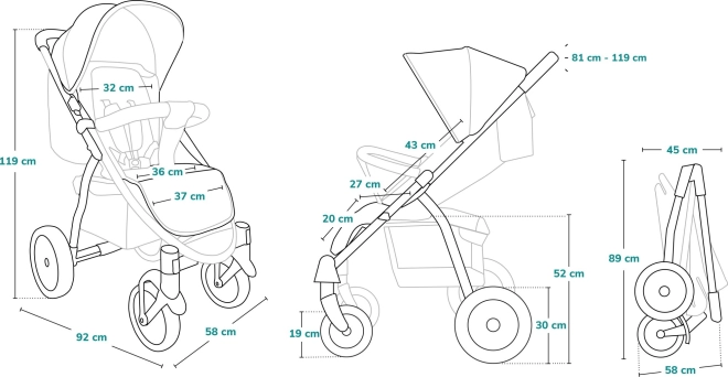 - Praktisch voor ouders: eenvoudig inklappen, verstelbare duwbeugel, mand 9 kg, bekerhouder, vak in de kap