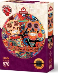 - Complete set: ronde puzzel met 570 stukjes, onderplaat, uurwerk met accessoires, 4 framestukken en 8 verbindingsclips.