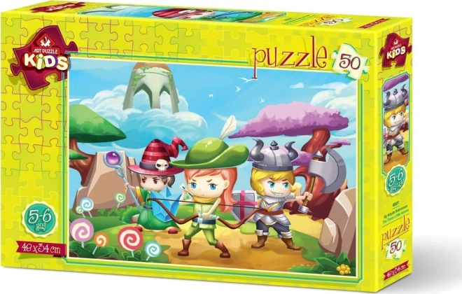 Ontdek plezier voor de allerkleinsten met een kwaliteits-puzzel van 50 stukjes die logisch denken, geduld en fijne motoriek ontwikkelt. De afbeelding “Drie kleine helden” zal zowel kinderen als ouders blij maken en meet na het leggen ongeveer 48 × 34 cm.