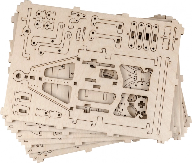 119 laser-gesneden onderdelen van berkenmultiplex passen exact in elkaar. De bouw is schoon, intuïtief en ook voor beginners goed te doen.