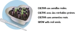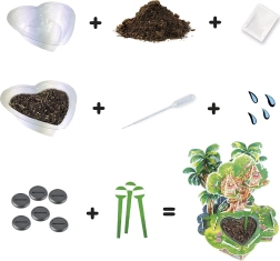 Decoratiestukken, een hartvormige bloempot, pipet, zakje potgrond, envelop met zaadjes en een duidelijke handleiding. Gewoon in elkaar zetten, zaaien en regelmatig water geven.