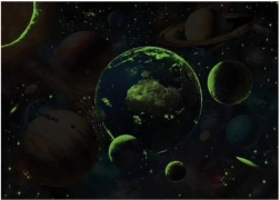 De neonpuzzelstukjes onthullen een prachtig beeld van planeten met gedetailleerde elementen, waaronder Saturnus en de Aarde.