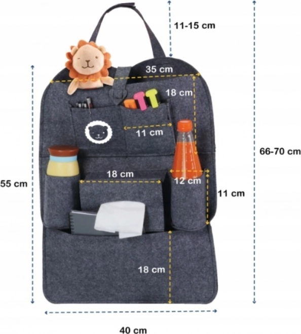 De universele auto-organizer LIONELO is een ideale hulp voor gezinnen en veelrijders. Dankzij de doordachte vakindeling bergt u speelgoed, drankjes, tissues en kleine benodigdheden overzichtelijk en veilig op. De neutrale grijze kleur past in elk interieur en beschermt tegelijk de achterkant van de stoel tegen schoenafdrukken en vervuiling.