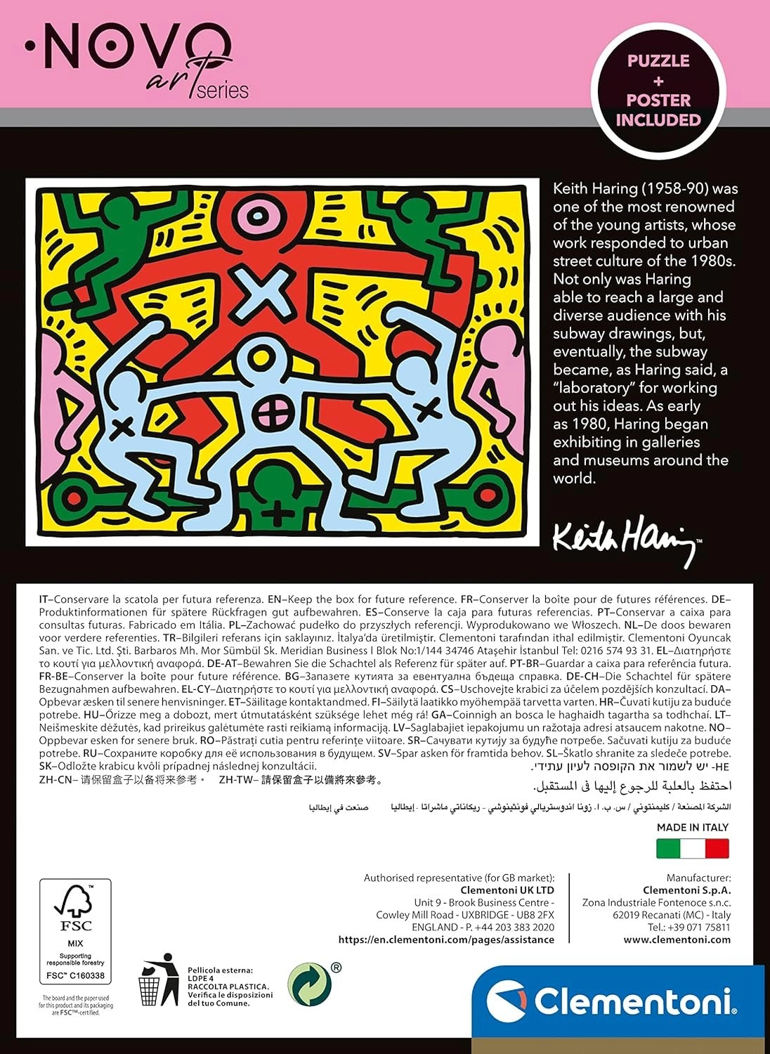 Geniet van uren ontspanning met het leggen van hoogwaardige puzzels van CLEMENTONI. Dit motief uit de Novo Art Series brengt het iconische werk van Keith Haring op 1000 stukjes met uitstekende scherpte en drukkwaliteit, precieze stans en perfect passende stukjes. Puzzelen ontwikkelt concentratie en fijne motoriek en is geweldig vermaak voor zowel kinderen als volwassenen.