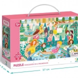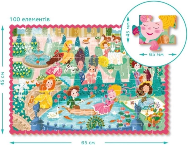 Vrolijke kinderpuzzel voor kleine sprookjesliefhebbers: 100 stukjes met een prinsessenthema op de promenade in het formaat 65 × 45 cm. Ideaal vanaf 5 jaar, ondersteunt de ontwikkeling van logisch denken, geduld en fijne motoriek. De praktische doos met een handvat voor eenvoudig dragen zorgt voor plezier thuis en onderweg.