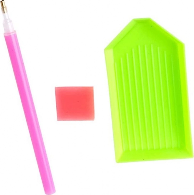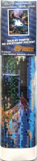 Verpakking bevat: canvas met voorbedrukte afbeelding, pen voor het aanbrengen van steentjes, schaaltje om steentjes in uit te gieten, was voor het plakken, set gekleurde steentjes.