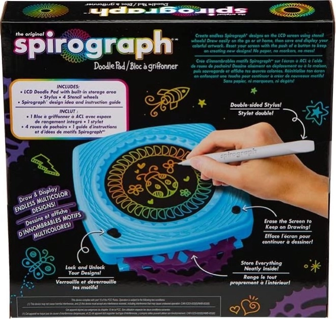 Inhoud van de verpakking: LCD Spirograph, 4 Cyclex-wieltjes opgeborgen in een compartiment, dubbelzijdige stylus, handleiding. Voeding: 2× AAA-batterijen (niet inbegrepen).