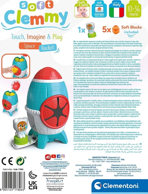 Deze kleurrijke Soft CLEMMY box in het design van een ruimteraket biedt kinderen van 10–36 maanden een veilige en stimulerende omgeving voor de eerste bouw- en ontdekspelletjes. De zachte blokken voelen prettig aan, zijn makkelijk in te drukken en dankzij de getextureerde oppervlakken prikkelen ze de tastzin. Het beer-astronautfiguurtje kan op de blokken worden gezet en nodigt uit tot creativiteit en thematisch spel.