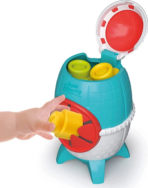 Het raketdesign met deksel en zijopening maakt van de box een slimme speelgoedset én een praktische opbergoplossing. Kinderen oefenen met insteken, uithalen en oog-handcoördinatie.