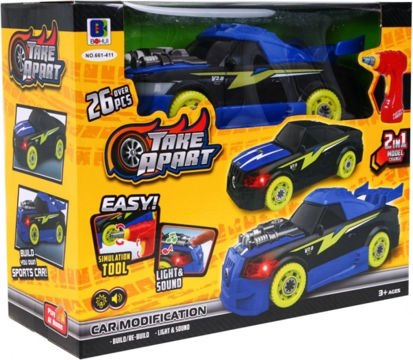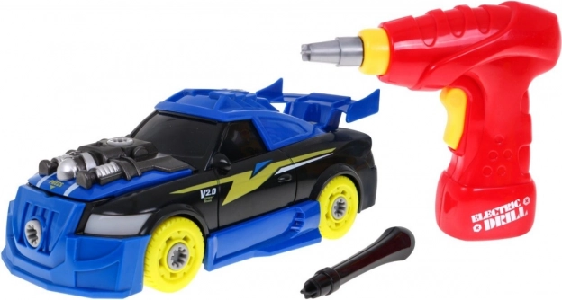 Inhoud van de set: - montage-onderdelen voor het autootje, - schroefboormachine, - handschroevendraaier. Afmetingen: - autootje ca. 22 cm x 9 cm x 10 cm, - schroefboormachine ca. 13,5 cm x 15 cm x 3,5 cm, - handschroevendraaier ca. 10 cm x 2 cm, - verpakking ca. 24 cm x 30 cm x 12 cm. |