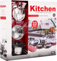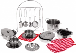 Deze set bevat verschillende metalen potten, pannen en servies voor een authentieke speelervaring. Het kind kan genieten van spelen met realistisch ogende keukenbenodigdheden.