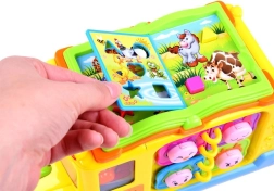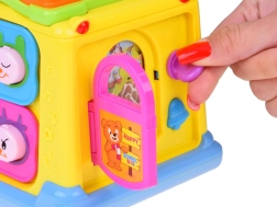 Aan één zijde zitten vier opvallende gezichtjes in gekleurde lijstjes als bladzijden van een boek, aan de andere zijde vier tandwielen met een slinger om aan te draaien. Achteraan vind je een deurtje met een bel en verwisselbare afbeeldingen die met een sleuteltje bediend worden. Het speelgoed ondersteunt de ontwikkeling van manueel-motorische vaardigheden, het leren van kleuren en vormen en het onderscheiden van geluiden. Geweldig als cadeau – wordt geleverd in een aantrekkelijke kleurrijke doos.