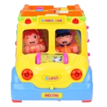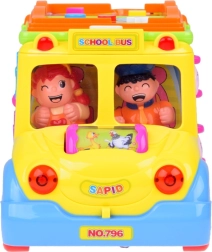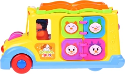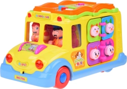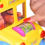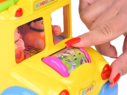 De interactieve schoolbus verrast met levendige kleuren, zorgvuldige afwerking en tal van functies. Tijdens het rijden klinkt vrolijke muziek en knipperen de koplampen. Bij een botsing met een obstakel verandert hij automatisch van richting, maar hij is ook handmatig te bedienen. De voorste draaibare rol met dieren laat bij het draaien kinderlachjes en korte melodieën horen. Op het dak bevindt zich een kleurrijk boekje met knoppen – elke knop activeert dierengeluiden, de claxon, het starten van de motor of melodieën.