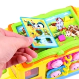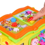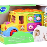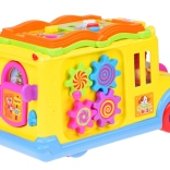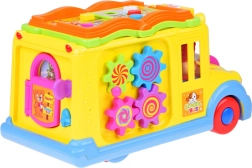 Een kleurrijke, speelse interactieve bus van hoogwaardige kunststof biedt kinderen volop plezier en leren. Hij kan zelf rijden, speelt melodieën af, licht op en reageert op obstakels. Op het dak zit een boekje met knoppen in verschillende vormen en kleuren die dierengeluiden, een claxon, het starten van de motor en melodieën activeren. Aan de zijkanten vind je tandwielen met een slinger en opvallende ‘gezichtjes’. Ideaal voor de ontwikkeling van fijne motoriek, vorm- en kleurherkenning en geluidswaarneming.
