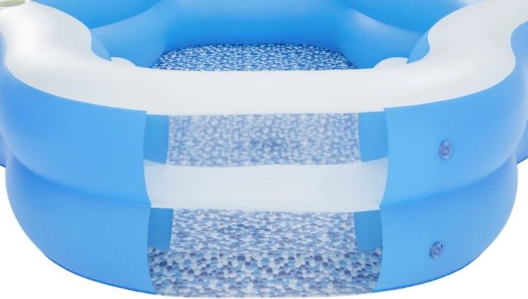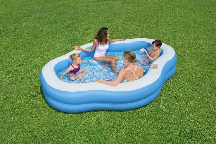 Opblaasbaar familiezwembad BESTWAY 270 × 198 × 51 cm met zitjes, bekerhouders en doorzichtig kijkraam. Duurzaam vinyl, 821 l, eenvoudig leeglaten.