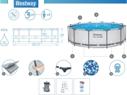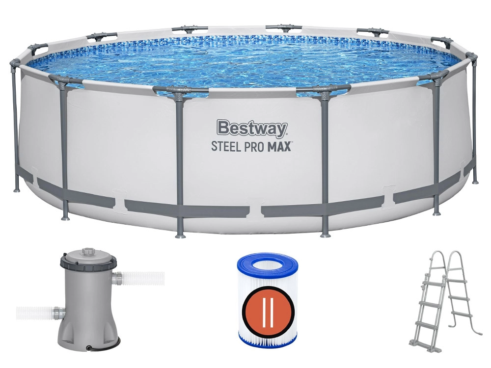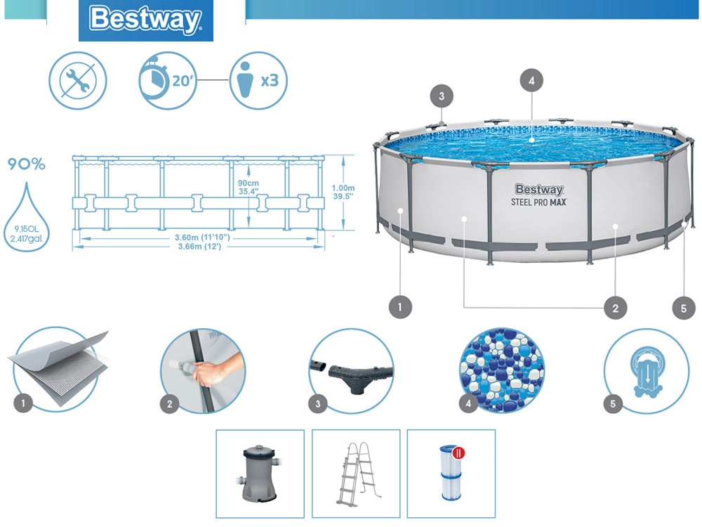 Inclusief filterpomp met cartridge type II, slangen en klemmen, zeefjes, doppen, reparatiepatch en een veilige afneembare ladder.