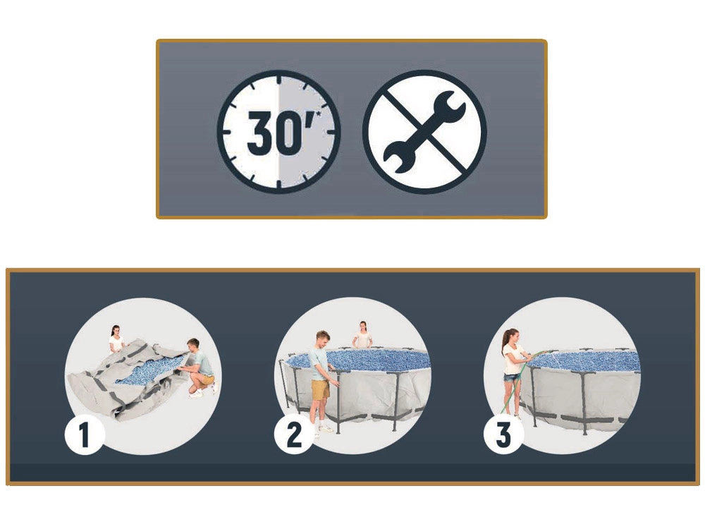 De afneembare ladder verhoogt de veiligheid doordat spontane toegang door kinderen zonder toezicht kan worden voorkomen. De filterpomp met cartridge (type II) houdt het water schoon, terwijl afvoerkleppen met doorstroomregeling het snel leeglaten na het seizoen vergemakkelijken. Eenvoudige montage, een stabiele constructie en uitgebreide accessoires maken dit de ideale oplossing voor zwemmen met het gezin in de tuin.