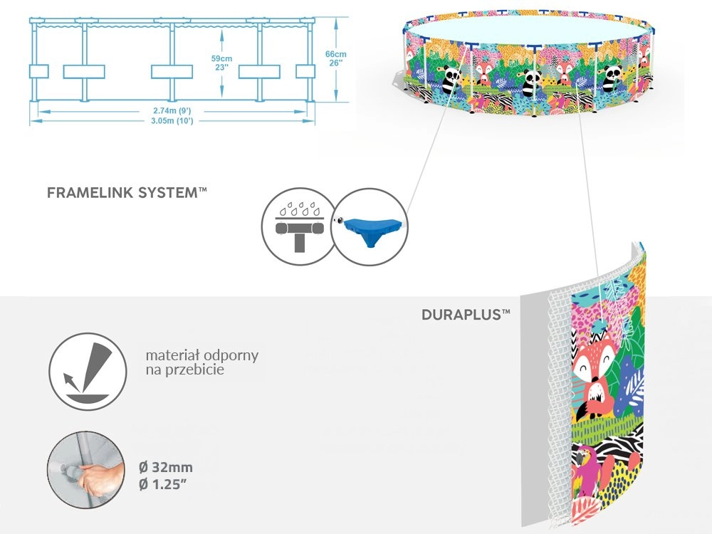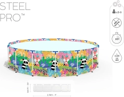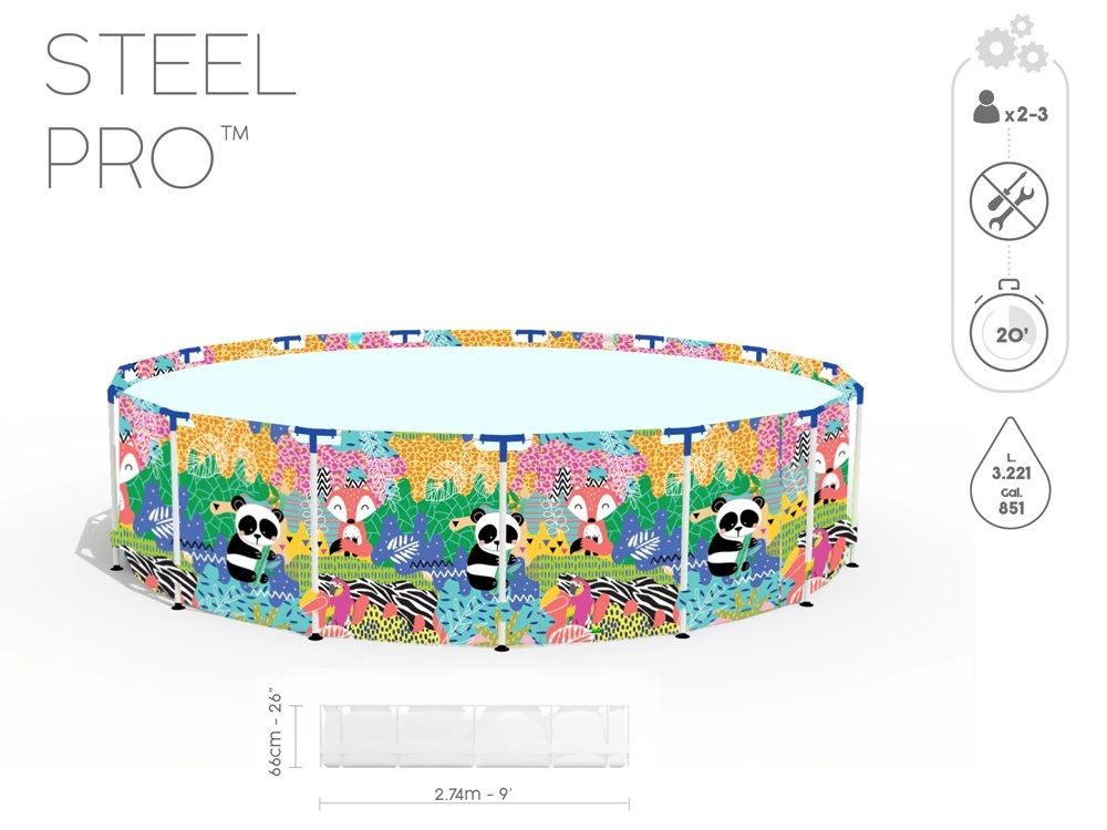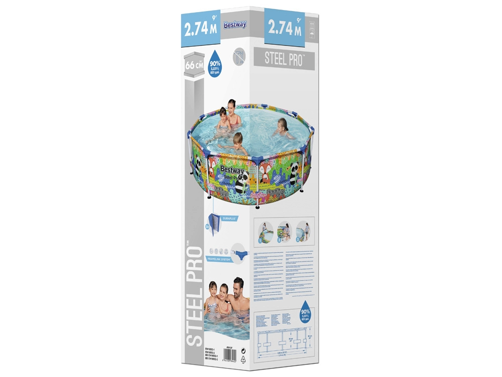 Geniet van de zomer met het ruime kinderframezwembad BESTWAY Steel Pro met afmetingen van 274 × 66 cm. De duurzame Steel Pro-constructie met FrameLink-systeem en het drielaagse DuraPlus-materiaal zorgen voor hoge stabiliteit en een lange levensduur. De kleurrijke dierenprint zal kinderen verrukken en het eenvoudige legen wordt mogelijk gemaakt door de geïntegreerde aftapkraan. Compatibel met het FlowClear-systeem.