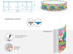 De Steel Pro-technologie met het FrameLink System minimaliseert corrosie in metalen verbindingen, terwijl het drielaagse DuraPlus-materiaal (polyestergaas tussen twee sterke PVC-lagen) de weerstand tegen scheuren en slijtage verhoogt. Dankzij de geïntegreerde aftapkraan en aansluitingen voor FlowClear is het onderhoud van het zwembad eenvoudig en snel.