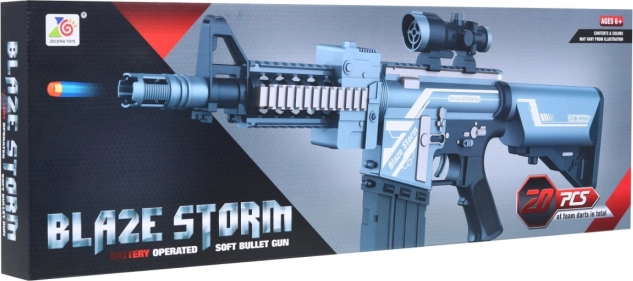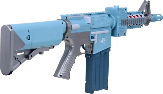 De elektrische compressor, gevoed door 5× AA-batterijen (niet inbegrepen), zorgt voor soepel, volautomatisch vuren – druk simpelweg de trekker in en elke druk lost één schot. Voor kinderveiligheid kan de trekker worden geblokkeerd met de ON/OFF-schakelaar. De lange loop met geleiderollen stabiliseert het schot voor meer precisie.