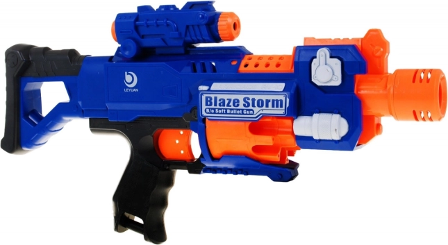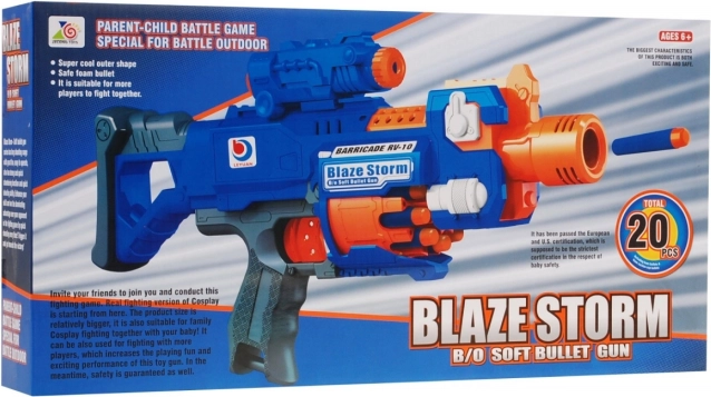 Geniet van actievolle fun met het elektrische kinderblasterpistool BLAZE STORM, dat zachte foamkogels afschiet. Biedt volledig automatische bediening, snelvuur tot 3 schoten per seconde, bereik rond 10 m en een afneembare kolf om te wisselen naar een compact pistool. Inclusief optisch vizier en 20 lange foamkogels voor veilig en leuk spel vanaf 8 jaar.