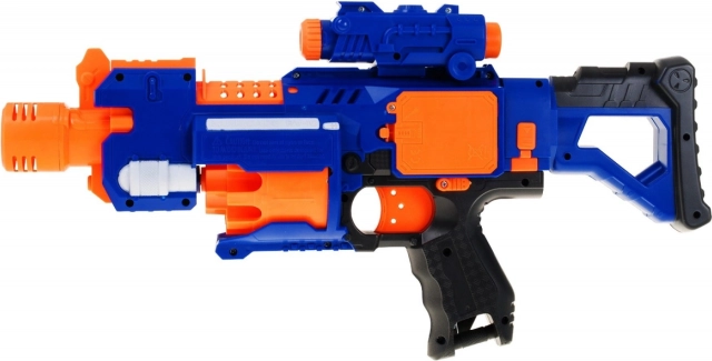 De afneembare kolf verandert de blaster in een compact pistool, de lange loop met twee roterende rolletjes stabiliseert het schot en het meegeleverde vizier verbetert het mikken. De veiligheid wordt verhoogd door een ON/OFF-schakelaar om de trekker te blokkeren. In de verpakking vind je 20 foamkogels, dus niets staat lange en veilige pret in de tuin of thuis in de weg.
