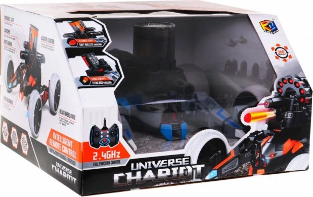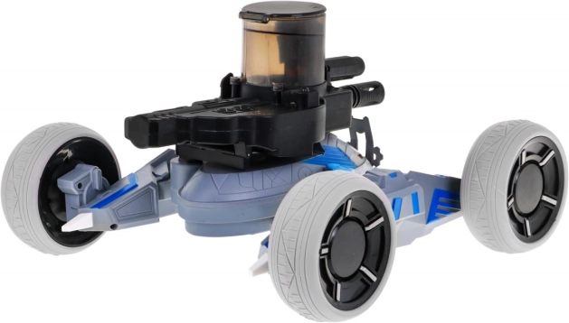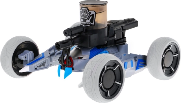 Grote rubberen wielen met antislipprofiel en functionele schokdempers garanderen een soepele rit binnen en buiten. Het geïntegreerde treffersensorsysteem registreert hits – na de derde treffer schakelt het voertuig uit en moet het opnieuw worden gestart, wat spanning en eerlijke spelregels toevoegt.