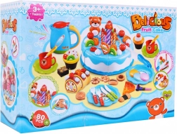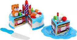 Deze grote feestset biedt kinderen uren fantasierijk spel. De zesdelige taart wordt met klittenband samengehouden en kan met de meegeleverde messen “gesneden” worden. Dankzij kleine openingen kan de taart rijkelijk worden versierd met fruit, toppings, kaarsjes en een schattige beer. De grotere kaars licht in twee kleuren op na het indrukken van een knop, wat het feest een betoverende sfeer geeft.