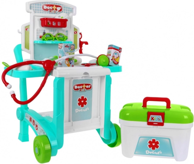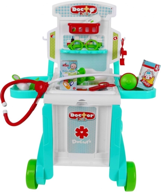Deze doktersset voor kinderen in zachte pasteltinten biedt uren speelplezier en leren. De verrijdbare tafel verander je eenvoudig in twee verschillende trolleys, afgestemd op de leeftijd en lengte van het kind, terwijl het koffertje alle instrumenten veilig opbergt. Op de tafel vind je 2 zijplankjes voor benodigdheden en een opzetpaneel met plankjes en haakjes voor ‘medicijnen’ en accessoires. Dankzij de handgreep verplaats je de hele praktijk moeiteloos van kamer naar kamer.