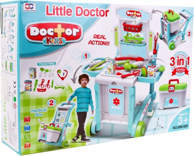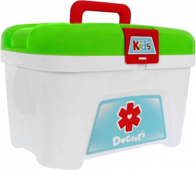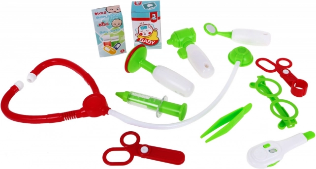 Alles wat een kleine dokter nodig heeft is inbegrepen: stethoscoop, bril, twee scharen (ook met afgeronde punt), pincet, spuit, thermometer, doosje met pleisters en kompressen, onderzoekspiegeltje, onderzoeksopzetstuk, hamertje en stickers. Spelen helpt angst voor de dokter te verminderen, ontwikkelt sociale vaardigheden en stimuleert de verbeelding.