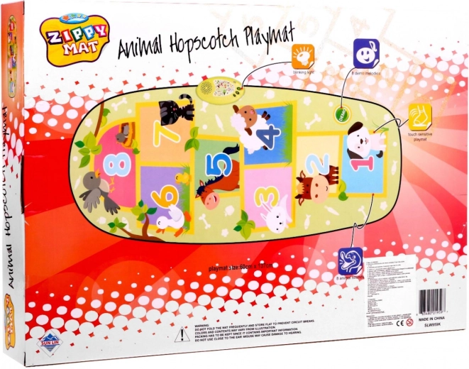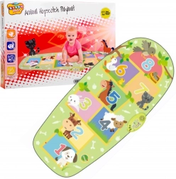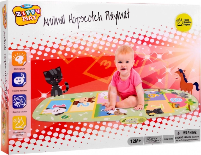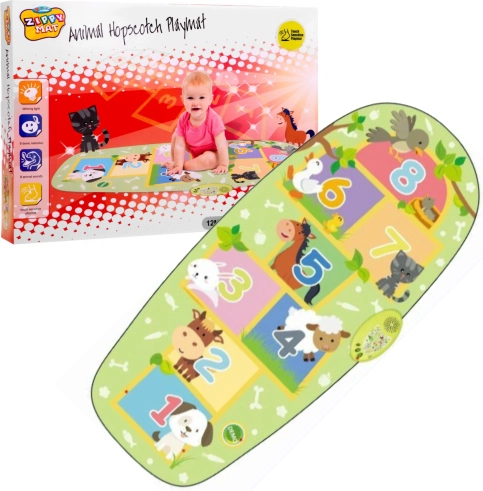 De interactieve “hinkelen”-mat verandert elke kinderkamer in een speelparadijs. Door op de vakken te springen activeren kinderen echte dierengeluiden (hond, koe, konijn, lammetje, paard, eendje, kat, vogels) en kunnen ze kiezen uit 8 aangename muzikale achtergronden. Het grote, kleurrijke paneel met lichtjes en knoppen is intuïtief en nodigt uit tot ontdekken.