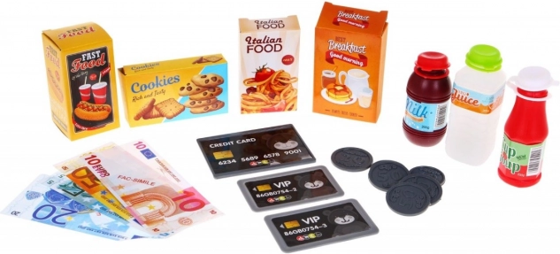 De set bevat ook imitatie-voedingsmiddelen zoals ketchup, sap, melk en diverse kartonnen doosjes, die het spel en de verbeelding van kinderen verrijken.