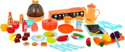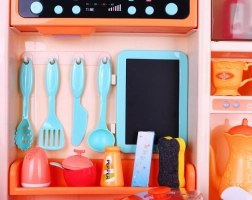 Bevat 65 stuks accessoires: servies, klittenband-voedsel, kookgerei, krijtbord en een speciale eierkoker met licht en geluid. De keuken is stabiel, kleurrijk en perfect op maat voor kinderen vanaf 3 jaar.