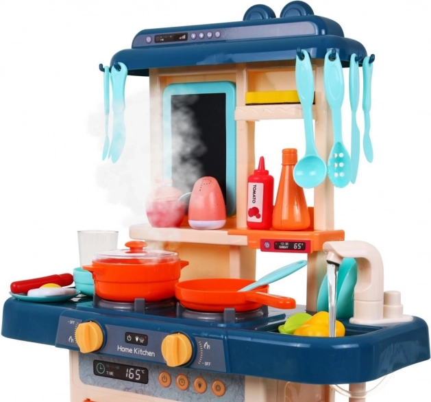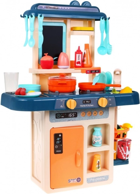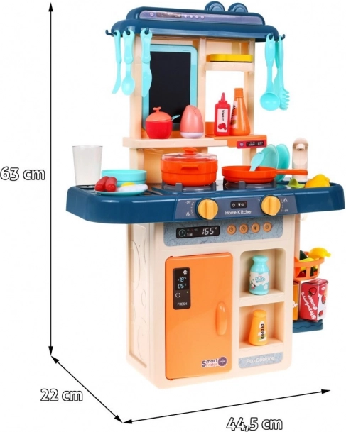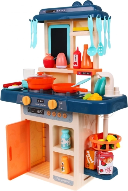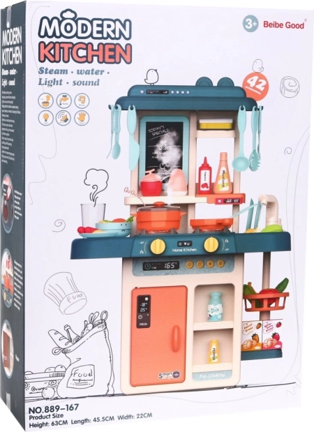 Onderdeel is een functionele gootsteen met kraan die je met water kunt vullen, een te openen koelkast, praktische plankjes en een krijtbord boven de kookplaat waar kinderen hun recepten of lijstjes kunnen schrijven. De complete set bevat 42 onderdelen, waaronder servies, etenswaren en keukenaccessoires. Het speelgoed werkt op 3× AA-batterijen (niet inbegrepen) en heeft CE-certificering.