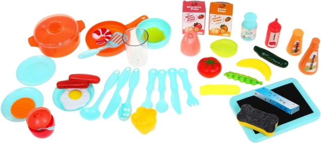 - kitchen, tekenbord, 2× krijt, spons, pan (ca. 12 × 9 × 4 cm), koekenpan met deksel (ca. 14 × 9 × 4 cm), kom (ca. 7,5 × 3 cm), 3× bord (Ø ca. 7,5 cm), beker (ca. 6,5 × 5 cm), spatel, 2× mes, 3× lepel, vork, zoutvaatje, bakje met deksel, 2× koekjesdoos, glaasjes en flesje, fruit en groenten (paprika, tomaat, banaan, komkommer, erwtjes, slablad, Chinese kool, plakje wortel, plakje paprika), garnaal, spiegelei, worstjes
