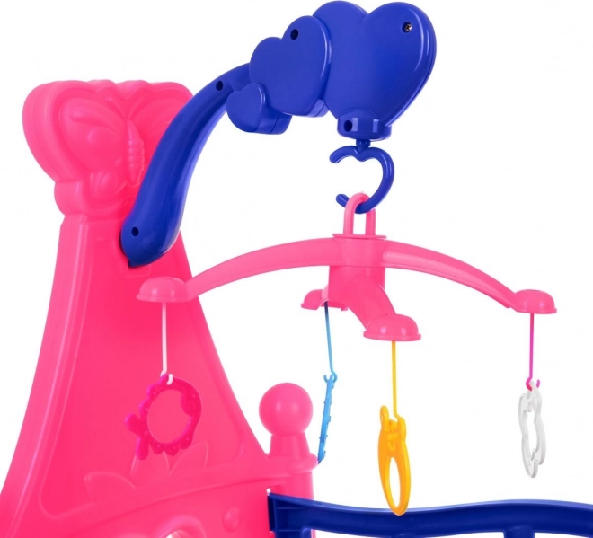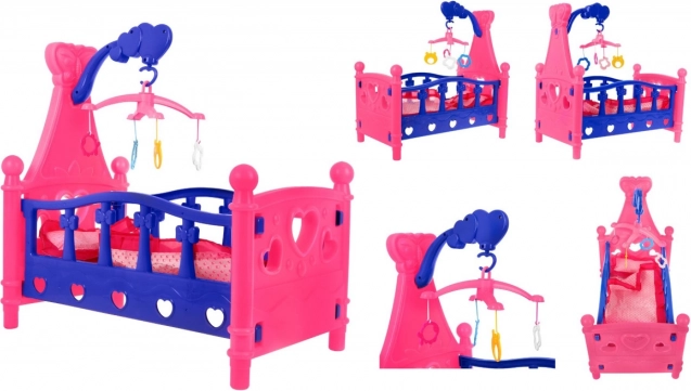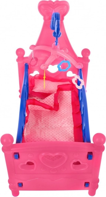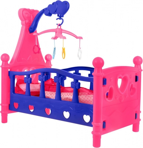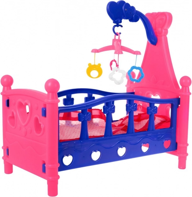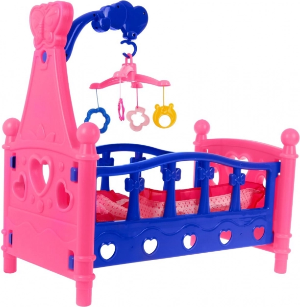Dit poppenbedje is een geweldige toevoeging aan elke kinderkamer. Het valt op door de vrolijke roze-blauwe kleurcombinatie, hartvormige uitsparingen en een functionele mobiel met kleurrijke hangers. Ook inbegrepen zijn een stoffen matras, kussentje en deken, zodat de lievelingspop heerlijk kan slapen.