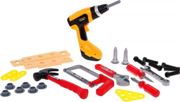 Complete kindergereedschapsset voor kleine doe-het-zelvers vanaf 3 jaar met 26 onderdelen voor realistisch klusspel. Inclusief een interactieve accuboormachine op batterijen, sleutels, hamer, schroevendraaiers, zaagje, schroeven en koppelstukken. Dankzij het realistische design en de geluiden tijdens het schroeven ontwikkelen kinderen hun fijne motoriek, creativiteit en technische vaardigheden.