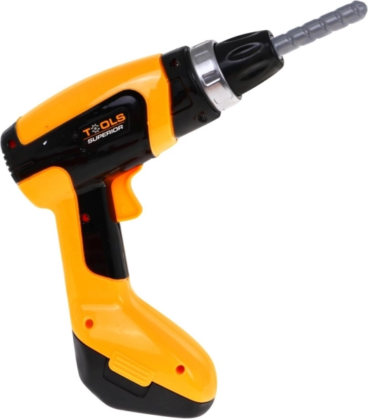 De boor/schroevendraaier werkt op 2× AA-batterijen (niet inbegrepen) en maakt kenmerkende geluiden bij vast- en losdraaien, wat de realistische spelbeleving versterkt.