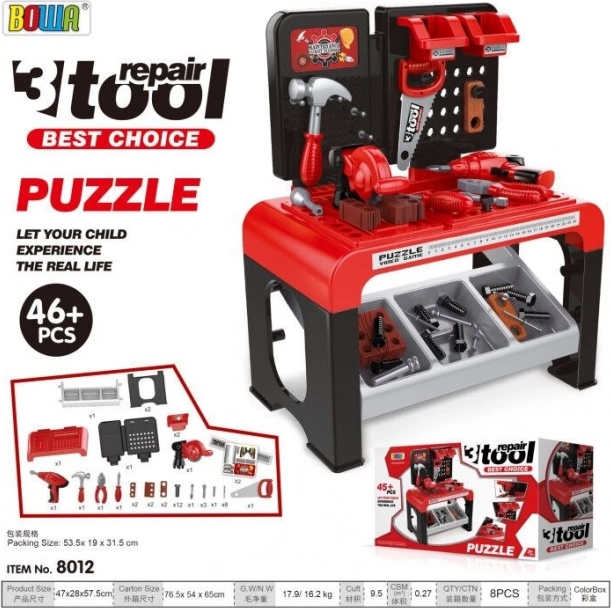 De set bevat 46 onderdelen, waaronder een handboor, een schroevendraaier met verwisselbare opzetstukken, een handzaag en cirkelzaag, hamer, tang, houten plankjes om te schroeven, schroeven, pennen en spijkers. Het opbergplankje en twee hangboxen houden het gereedschap netjes, zodat na het spelen alles eenvoudig kan worden opgeruimd.