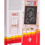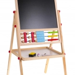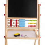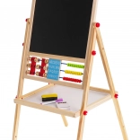 Groot houten, dubbelzijdig bord voor kinderen vanaf 3 jaar met een witte magnetische whiteboardzijde en een zwarte krijtbordzijde. Inclusief telraam, leerklok en wiskundepuzzel, een praktisch legplankje en verstelbare hoogte. In de set zitten een stift met gum, gekleurde krijtjes en een sponsje – alles voor creatief schrijven, tekenen en spelenderwijs leren.