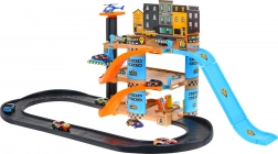 Deze grote en stevige parkeertoren biedt vier niveaus vol plezier. Bovenin is een helikopterplatform, terwijl een leuke glijbaan naar beneden leidt voor kleinere auto’s. Op elke verdieping zijn parkeerplaatsen en op de tweede verdieping bevindt zich een helling naar beneden. Op de begane grond vind je een autowasstraat, een benzinestation en een beweegbaar serviceplatform. Elke verdieping is bereikbaar met de handbediende krachtige lift.