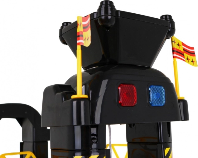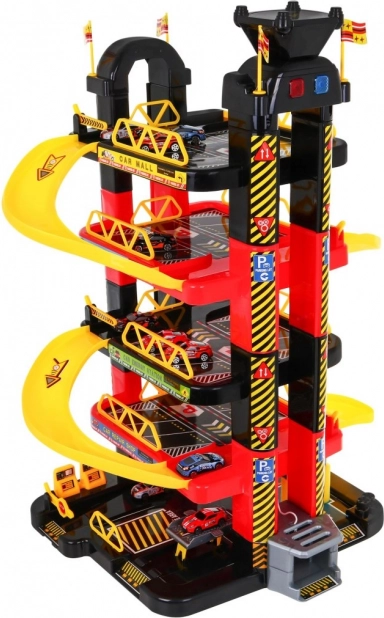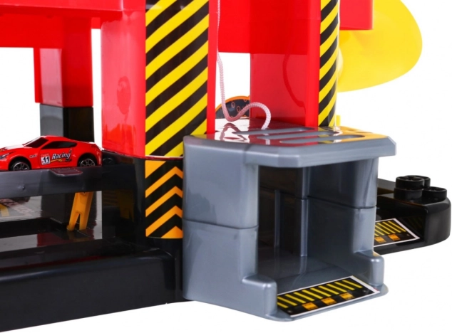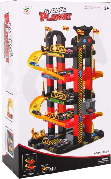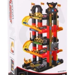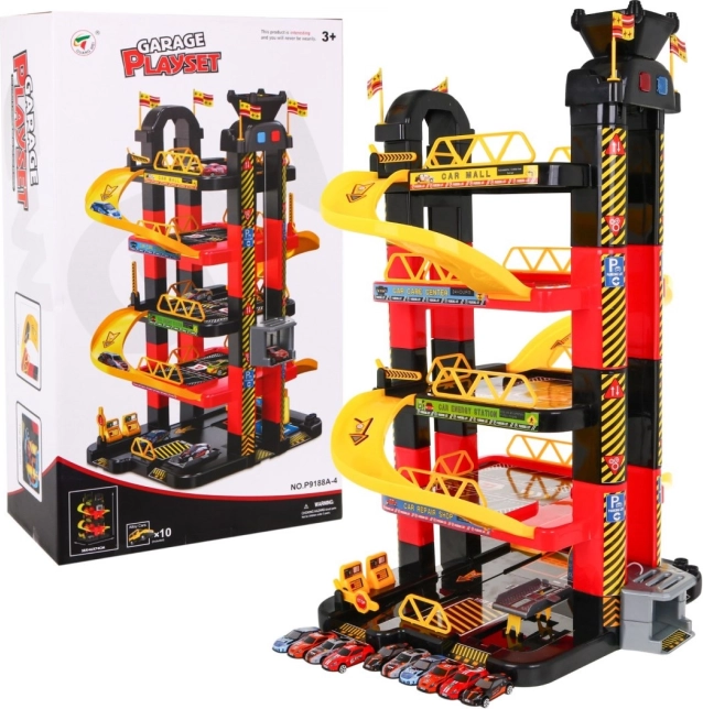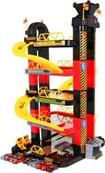 De kinderparkeergarage biedt een spannende speelomgeving met vijf niveaus, toegankelijk via de lift en glijbanen. De onderste verdieping bevat een autowasstraat, autowerkplaats en een tankstation. De hogere niveaus dienen als parkeerdek voor auto’s, terwijl helemaal bovenin een helikopterplatform is met een bewegende lift met lichteffecten, aangedreven door drie AA-batterijen (niet inbegrepen).