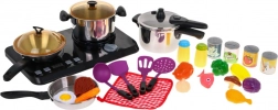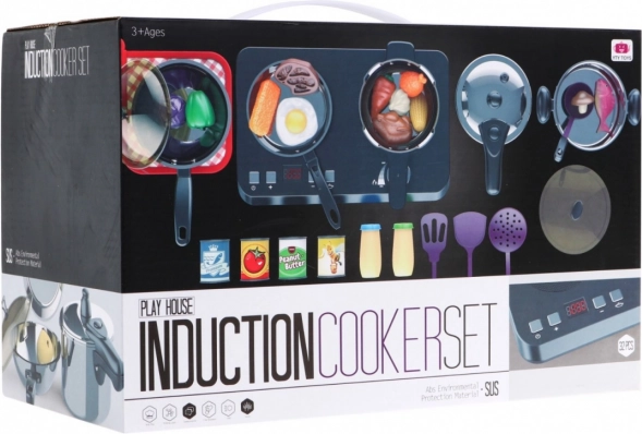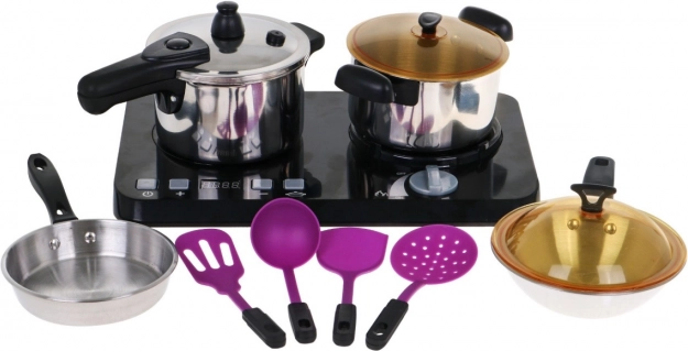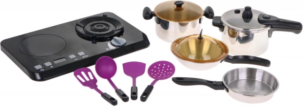 | Geweldige, uitstekend uitgeruste keukenset bestaande uit een inductiekookplaat, pannen en kookaccessoires, bedoeld voor kinderen vanaf drie jaar. De koekenpan, pan en snelkookpan zien eruit als echte, maar dan in miniatuur. De inductiekookplaat werkt op 3 AA 1,5 V batterijen (niet inbegrepen) en is voorzien van geluid- en lichteffecten. Links bevindt zich een verlichte brander met kookgeluiden en een paneel om de kooktijd in te stellen van 2 tot 20 minuten. Rechts is er een verlichte brander met bakgeluiden en een aan/uit-knop. Het pakket bevat ook imitatie-voedingsmiddelen. | ||
