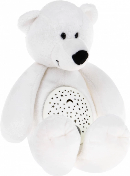 Het buikje van de beer projecteert een sterrenhemel op plafond en muren in rustgevende kleuren (rood, blauw, groen, paars). Het zachte licht creëert een aangename sfeer in de kinderkamer.