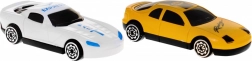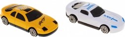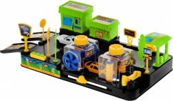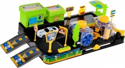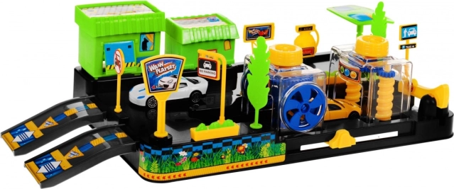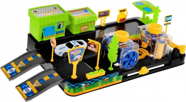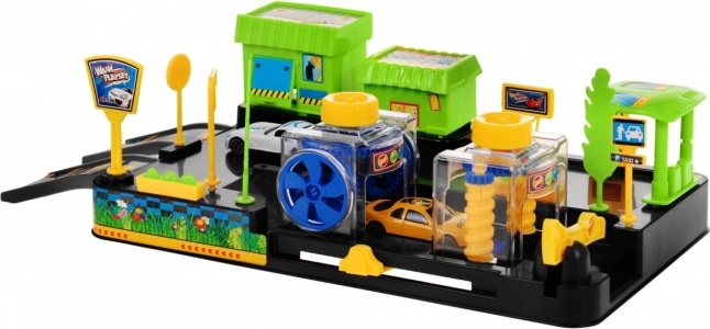 In de doos vind je 2 autootjes, hellingen, slagbomen, borden en decoraties, inclusief een tankstation en een winkel/restaurant.
