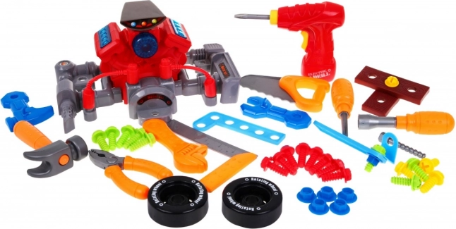 De set bevat diverse gereedschappen zoals een hamer, schroevendraaier, zagen en sleutels. Deze gereedschappen ontwikkelen de vaardigheden van je kinderen en stimuleren hun verbeelding.